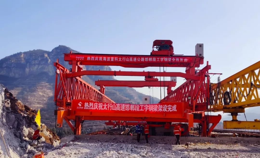 (海波重科新聞報(bào)道)2019年11月19日,由海波重科承接的太行山高速公路邯鄲段工字鋼梁全線(xiàn)貫通。甲方華川集團(tuán)黨委書(shū)記、董事長(zhǎng)、總裁謝應(yīng)文、總工程師曾昭明、華北片區(qū)指揮長(zhǎng)陳杰、項(xiàng)目經(jīng)理牟世輝、海波重科總經(jīng)理劉乾俊、項(xiàng)目執(zhí)行經(jīng)理趙占云、項(xiàng)目總工甘泉等領(lǐng)導(dǎo)共同見(jiàn)證這一振奮人心的時(shí)刻。