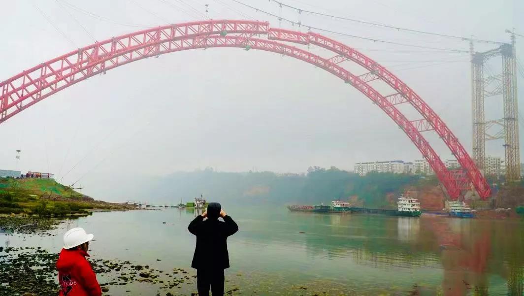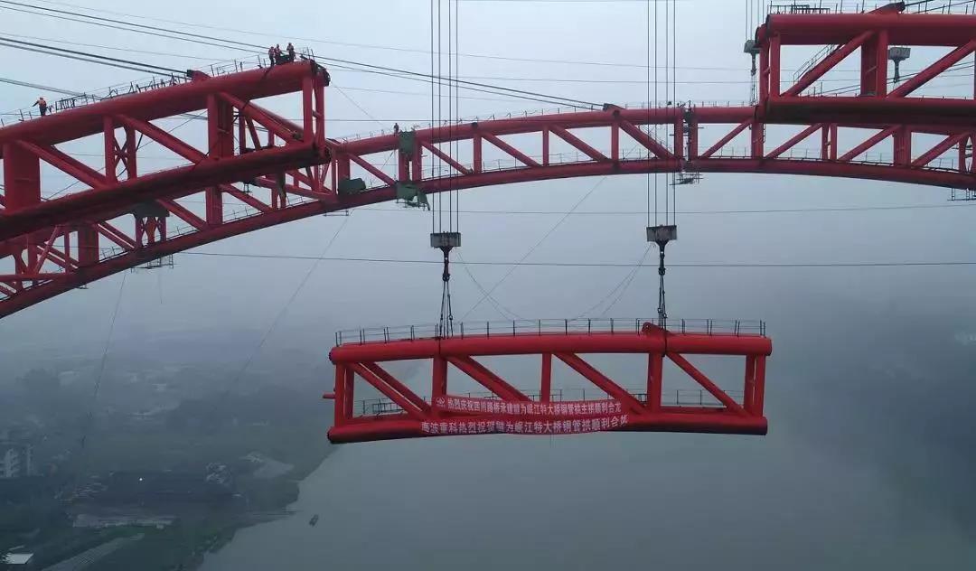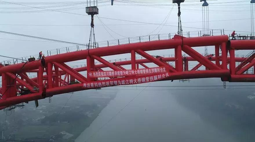 (海波重科新聞報道)2020年1月15日,犍為岷江特大橋施工現(xiàn)場,只見高高的吊塔聳立岷江兩岸,纜索吊裝系統(tǒng)已準(zhǔn)備就緒;江面上,運(yùn)輸船舶搭載著最后一段拱肋,將其運(yùn)送到指定位置?!伴_始吊裝!”伴隨著現(xiàn)場一聲指令,拱肋從江面緩緩升起。經(jīng)過1個多小時的吊裝,上午10時42分,由海波重科承接的犍為岷江特大橋主橋457.6m鋼管拱橋,完成最后一段拱肋吊裝,實(shí)現(xiàn)了拱圈高精度合龍,合龍精度3mm,合攏應(yīng)力和全橋線形均滿足設(shè)計規(guī)范要求。