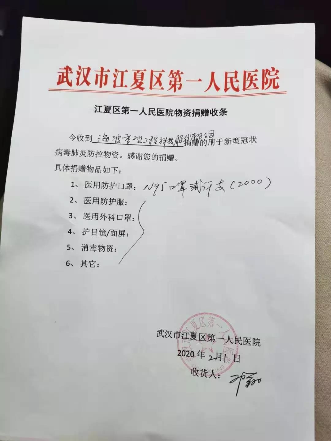 (海波重科新聞報道)一方有難,八方支援。為支援新型冠狀病毒肺炎疫情防控工作,2020年02月01日,海波重型工程科技股份有限公司向武漢市江夏區(qū)、武漢市經(jīng)濟技術開發(fā)區(qū)(漢南區(qū))相關部門共計捐贈現(xiàn)金及物資210000元,其中N95口罩2000只,定向捐贈給武漢市江夏區(qū)第一人民醫(yī)院,為抗擊新型冠狀病毒肺炎疫情貢獻綿薄之力。