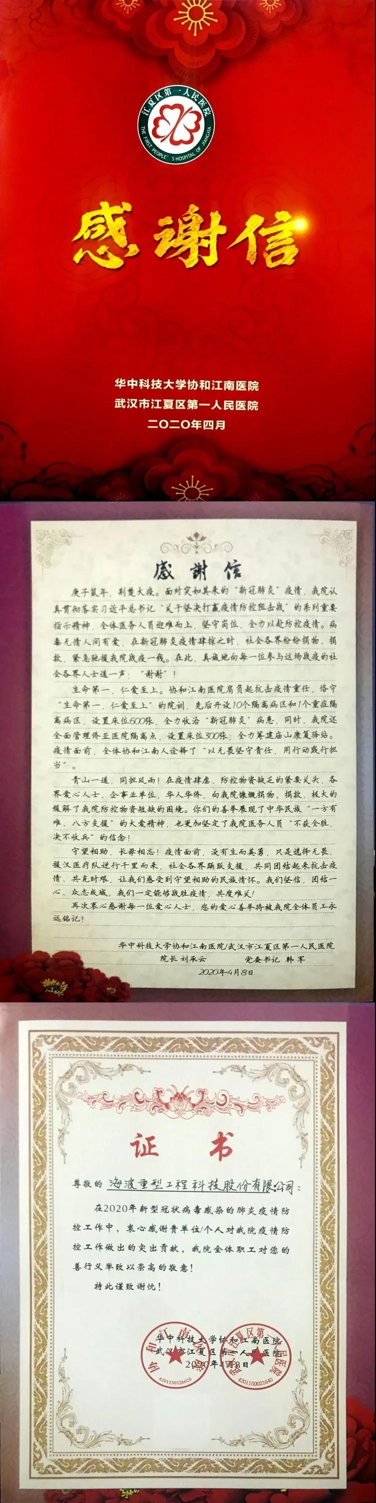 為疫情防控出力,海波重科義不容辭!收到感謝信,海波重科更是心懷感恩!雖然當(dāng)前武漢抗疫工作已取得了決定性的勝利,海波重科在積極復(fù)工復(fù)產(chǎn)的同時(shí)將以最嚴(yán)格的措施堅(jiān)決阻斷疫情向公司蔓延的渠道,全力守護(hù)好全體員工的生命安全和身體健康。