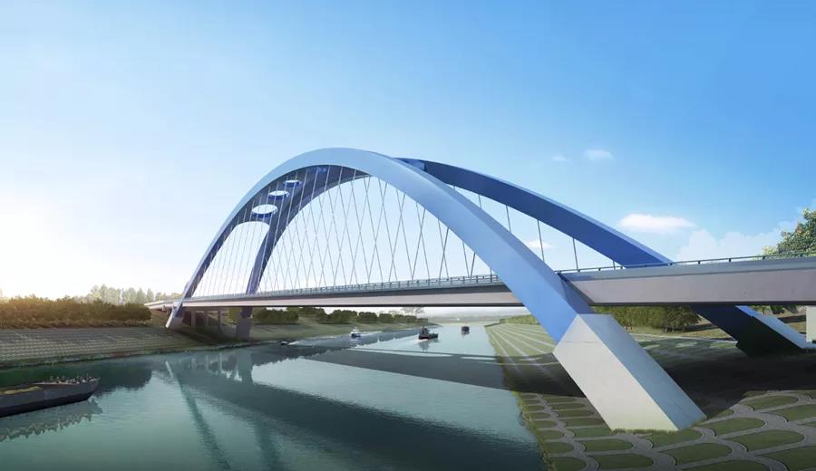 引江濟(jì)淮工程合銅黃高速公路橋,橋位位于安徽省合肥市廬江縣。全橋鋼結(jié)構(gòu)重量為7746噸,是安徽省水利“一號(hào)工程”,為地標(biāo)性高速公路橋。主橋采用鋼箱提籃拱橋一跨跨越引江濟(jì)淮工程水域。橋面采用首輪全匹配,其他輪次采用左右側(cè)主梁匹配制造,橫梁做成標(biāo)準(zhǔn)段發(fā)現(xiàn)場(chǎng)安裝,橫梁中間預(yù)留焊接環(huán)縫并加放補(bǔ)償量用于現(xiàn)場(chǎng)調(diào)節(jié)用;拱肋采用48米超高支架架設(shè)的安裝工藝。對(duì)全橋整體制造的線形控制精度要求極高。